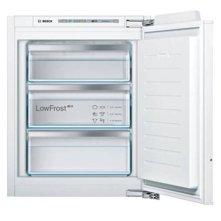 Congelatorul incorporabil Bosch GIV11ADC0 este conceput pentru integrare discretă în mobilierul de bucătărie, oferind funcționalitate eficientă într-un format compact. Tehnologia Low Frost reduce acumularea de gheață în interior, facilitând întreținerea și limitând necesitatea dezghețării frecvente.