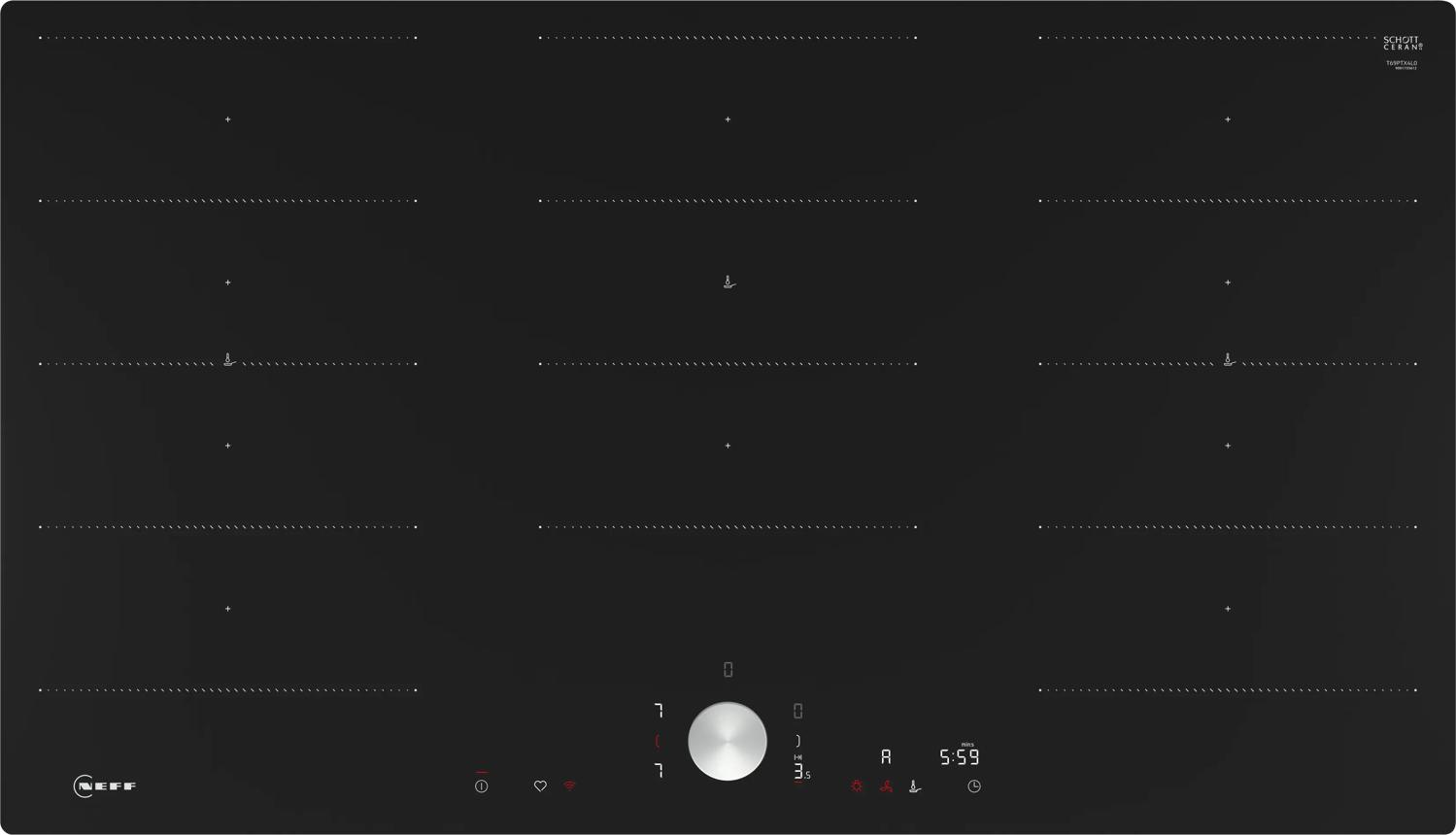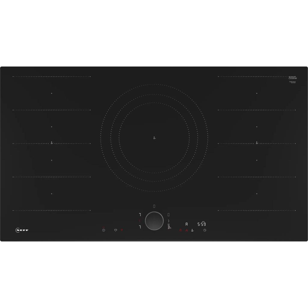 Plita cu inducție Neff T69TTX4L0 din gama premium N90 este proiectată pentru utilizatori avansați, oferind un spațiu generos de gătit de 90 cm și 5 zone de gătit, inclusiv zone flexibile pentru vase mari și combinații multiple.