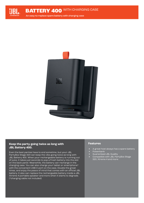 JBL Battery 400 with Charging Case este o baterie de rezervă oficială pentru difuzoare portabile compatibile JBL precum PartyBox Stage 320 și Xtreme 4, concepută pentru a prelungi autonomia redării fără întreruperi prin înlocuirea rapidă a bateriei epuizate. Include o carcasă de încărcare ce reîncarcă bateria între utilizări și funcționează și ca powerbank USB-C pentru încărcarea rapidă a smartphone-urilor sau tabletelor.