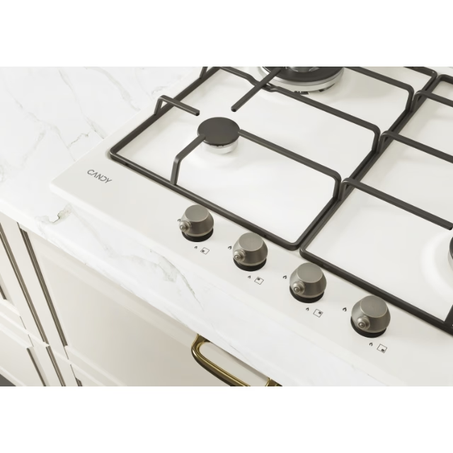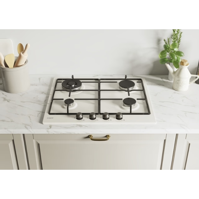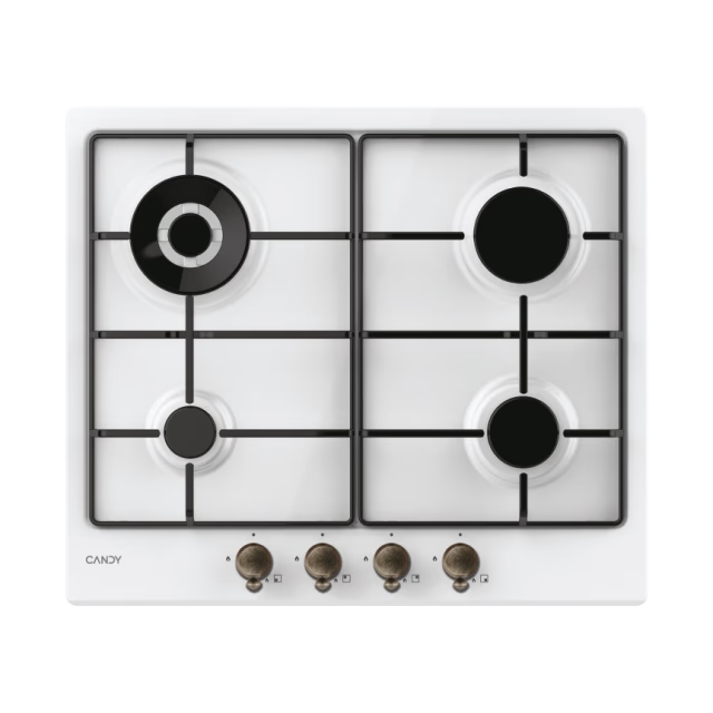 Plita încorporabilă Candy CHW6BR4WGTWA aduce un plus de rafinament bucătăriei tale prin designul său elegant din sticlă albă rezistentă la temperaturi înalte. Dispune de 4 arzătoare pe gaz, inclusiv unul Wok pentru gătit rapid și eficient, grătare din fontă și comenzi frontale ergonomice pentru confort sporit.