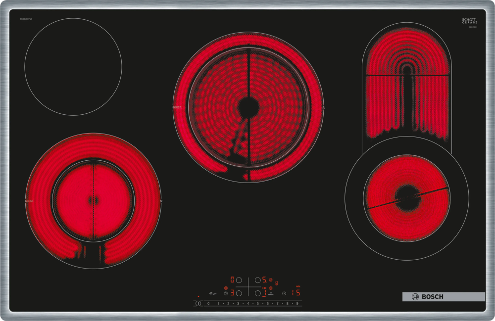 Plita vitroceramică Bosch PKC845FP1D din seria 6 este un model electric de 80 cm, conceput pentru integrare în blat, oferind o suprafață din sticlă ceramică care facilitează gătirea și curățarea.
